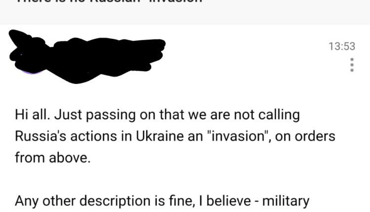 وتكشف الوثيقة عن منع موظفيها الأجانب من الإشارة إلى أن ما يحدث هو “غزو روسي لأوكرانيا”.