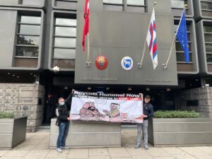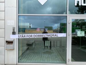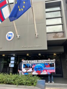 لكن سبقها بيوم، احتجاج آخر لنشطاء دنماركيين أمام مقر الشركة رفضًا لتورطها بانتهاكات السخرة والعبودية.