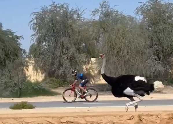ويوثق مقطع فيديو لنعامتين تجريان بسرعة على جانب طريق رملي ومقابل راكبي الدراجات.