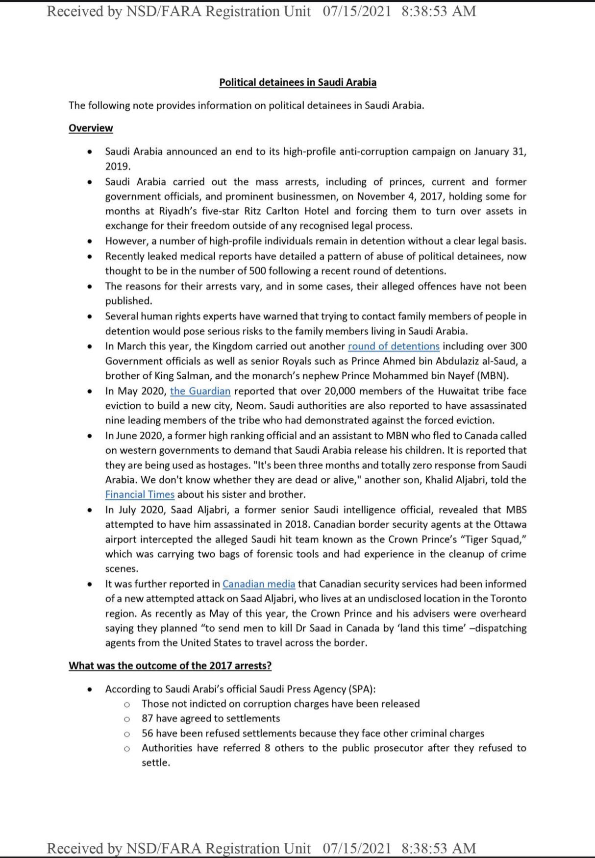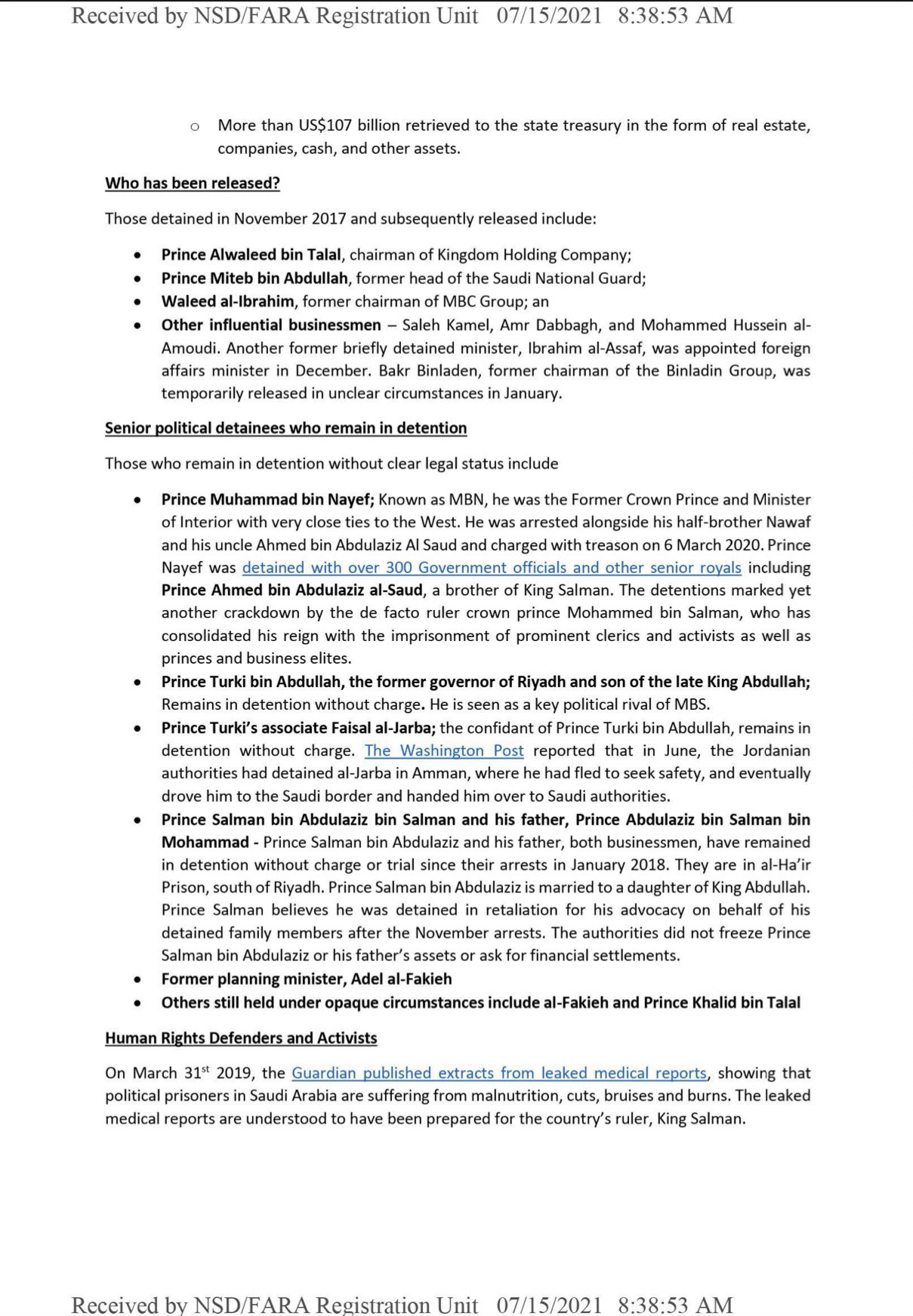 ولفتت إلى أن اثنين من المحتجزين كانوا من أكبر رجال الدولة نفوذا في السعودية.